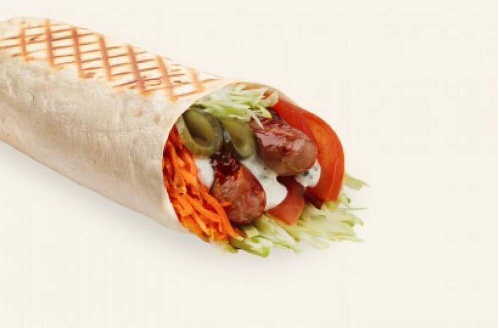 Сытная шаурма с свежим огурцом, капустой, помидором и охотничьими колбасками. Дополнена фирменным соусом.
