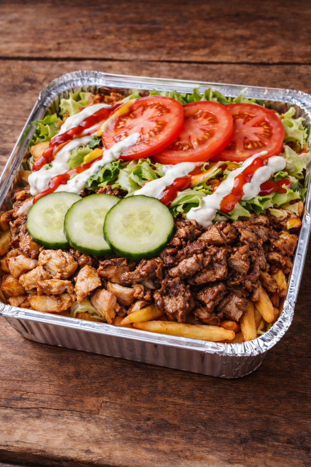 Слоями выкладывается в контейнер: хрустящий картофель фри, затем курица и говядина, сверху свежие овощи и расплавленный сыр. Финальный штрих — фирменный соус, объединяющий все вкусы в одно сытное блюдо.
