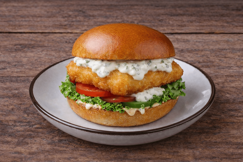 Сочная рыбная котлета в мягкой булочке, ломтик тягучего сыра Чеддер, хрустящий салат айсберг и свежий помидор. Нежный вкус рыбы в сочетании со сливочной текстурой сыра и свежестью овощей — лёгкий, сбалансированный и по-настоящему аппетитный выбор для тех, кто хочет насладиться морским вкусом в каждом укусе!