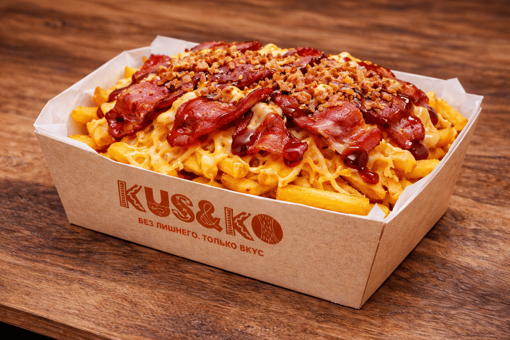 Хрустящий картофель фри с нежным сыром, сырным соусом, беконом, соусом барбекю и жареным луком