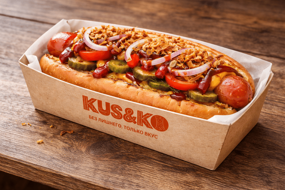 Мягкая булочка, сочная охотничья колбаска в сочетании с кетчупом, соусом барбекю, горчичным соусом и свежими овощами (болгарский перец, помидор, свежий лук, маринованный огурец). Завершает блюдо хрустящий жареный лук.